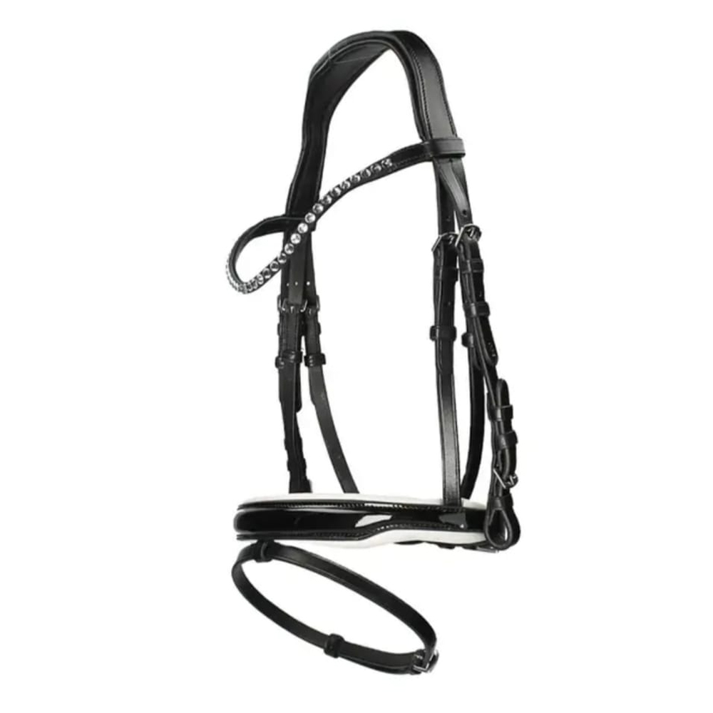 Anatomically shaped soft padded poll piece throat lash adjustable at both side stainless steel buckle and billets anatomically shaped soft padded noseband with flash soft, padded and shaped browband with diamante |