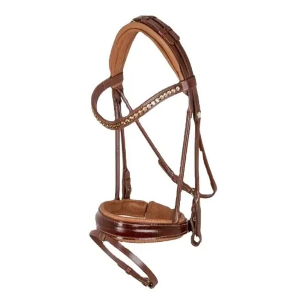 Anatomically shaped soft padded poll piece throat lash adjustable at both side brass buckle and billets anatomically shaped soft padded noseband with flash soft, padded and shaped browband with diamante |